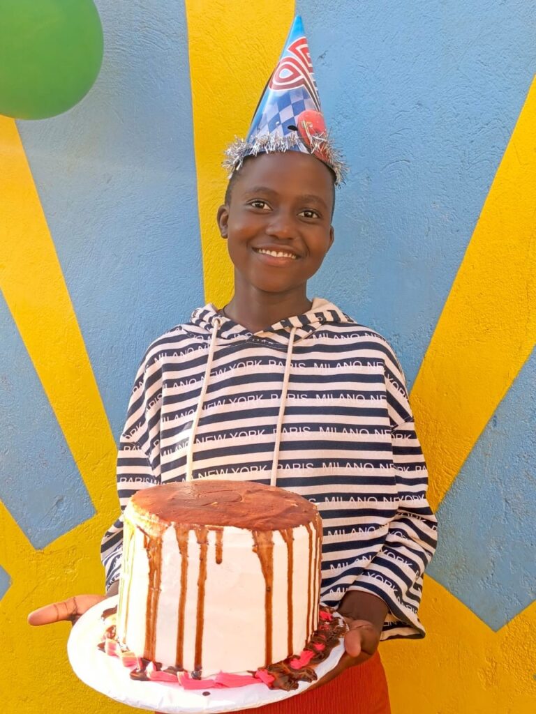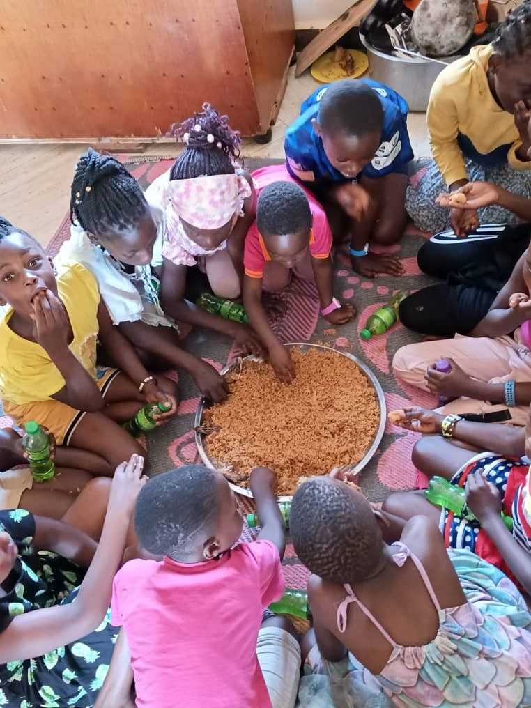 Das Youth Team hatte den Tag organisiert. Home und Hof wurden geschmückt, die Geburtstagstorte wurde wieder selber gebacken, die älteren Kids halfen Mum Barbra beim Kochen der Unmengen an Reis mit Gemüse und Fleisch. Es waren so viele Kids, dass es nicht für alle einen einzelnen Teller gab, aber auch hier sind die Kids entspannt und essen zu mehreren aus einem großen Teller traditionell mit den Händen und ohne Besteck!