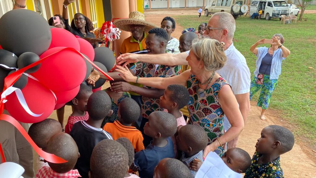 Die älteren MALAIKA Smile Kids aus Kampala hatten das Klassenzimmergebäude festlich mit Luftballons und Schleifen geschmückt und auch das obligatorische Band, das Christine und Uwe Irtenkauf zusammen mit Alex Ssekabira im Laufe der Feier zerschnitten, aufgehängt.