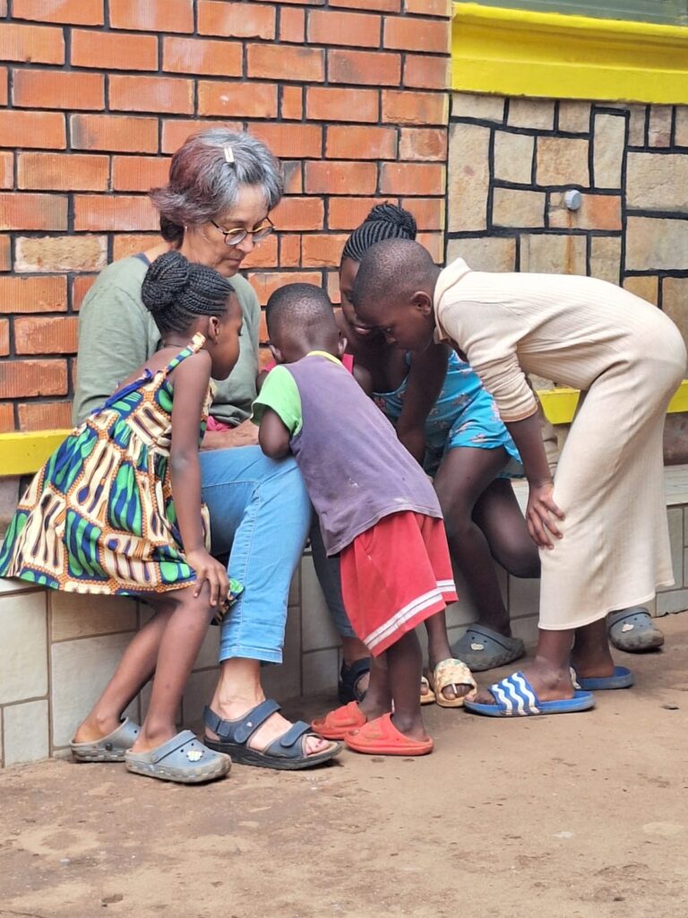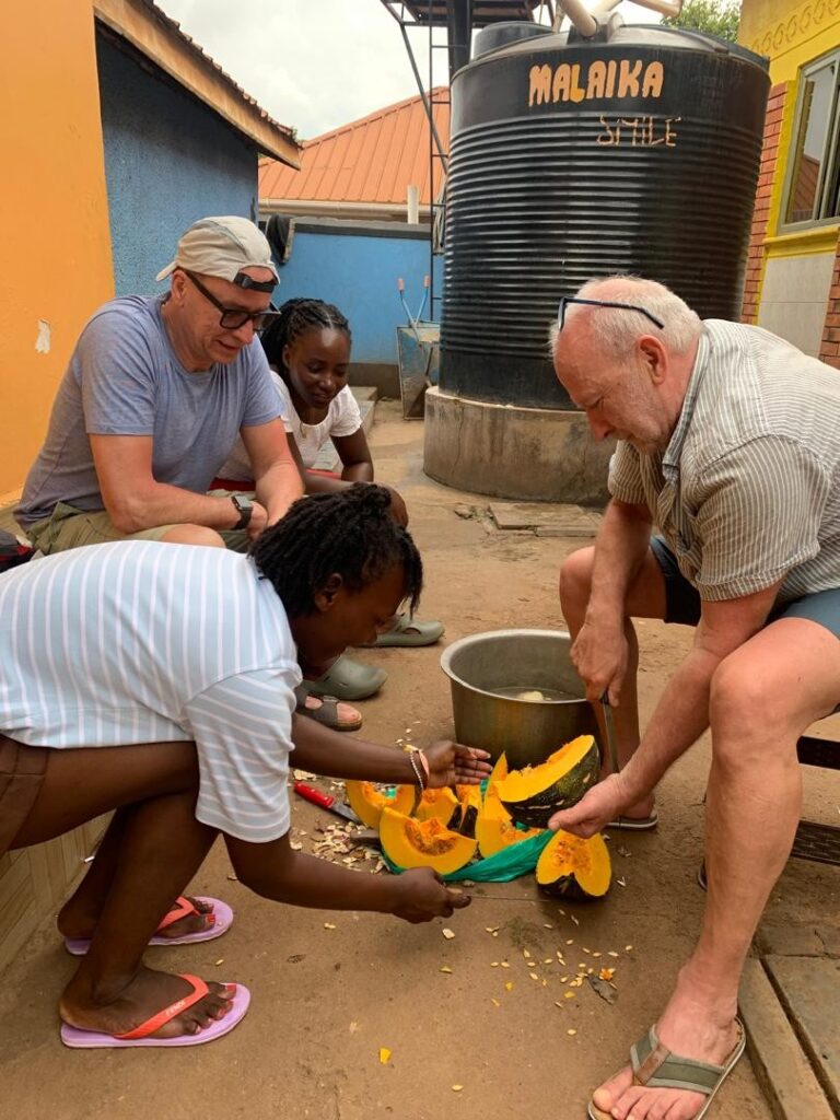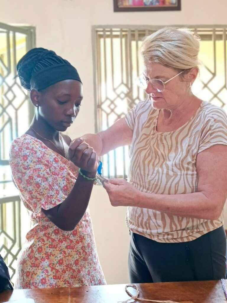 Techniker Joachim hatte außerdem einiges zu tun um die Elektrik auf Vordermann zu bringen, Lehrer Manfred zeigte den Kids wie man Kuchen backen kann, Lehrerin Silvia brachte eine Deutschlern-App mit und bastelte Freundschaftsbändchen, Heike und Barbara zeigten den Mädels wie man eine Mütze häkelt. Die Kids tragen gerne Mützen und „caps“. Petra und Volontärin Anne brachten manchen Kids die deutsche Sprache näher. Stefan fotografierte das ganze Geschehen mit einer „richtigen“ Kamera. Und natürlich gab es viele Gespräche mit den ugandischen Kids. Alles in allem gilt, dass alle sehr interessiert und neugierig sind und Neues lernen möchten. Und natürlich hatten die deutschen Gäste in ihren zweiten Koffern jede Menge gute Gaben für die Kids mitgebracht und halfen überall mit, sei es beim Gemüse schnibbeln oder Abwasch.