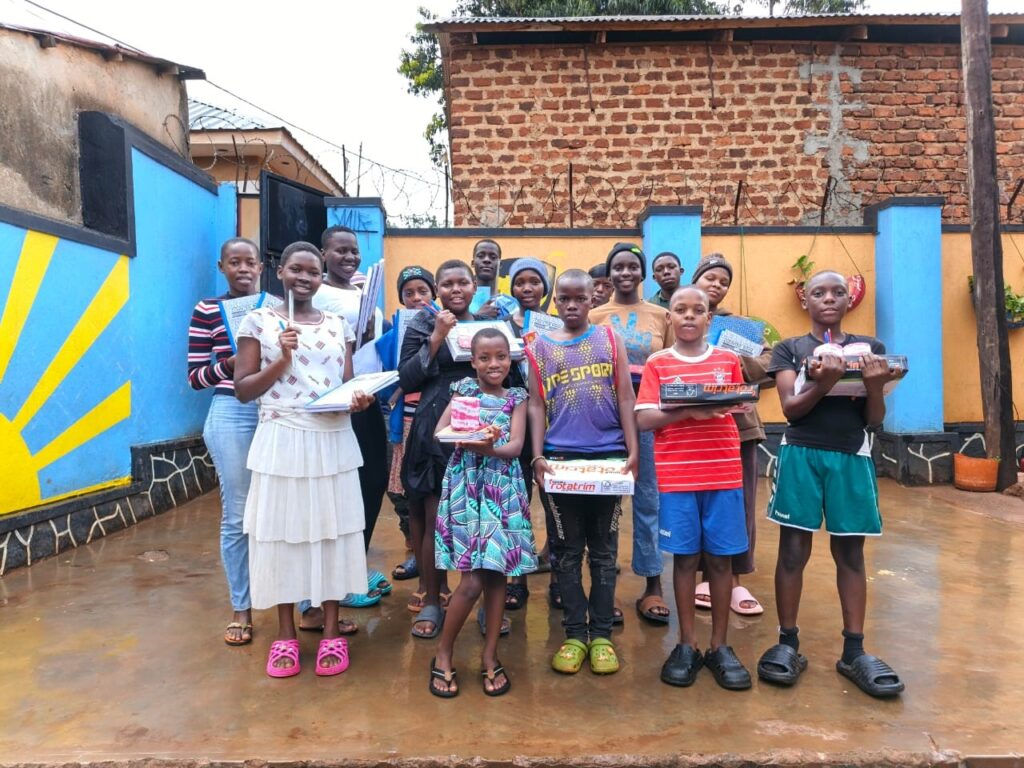 15 unserer 66 Schulkinder mit den neuen Heften, Stiften, weiteren Utensilien, inklusive Toilettenpapier, für den 3. Term.